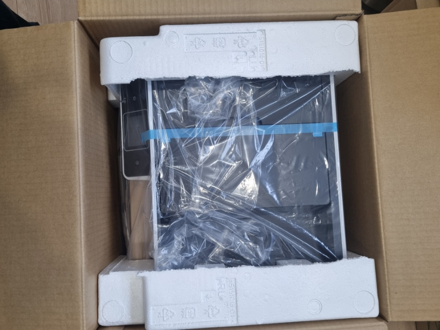 프린터 상자 채로 배송이 왔어요. 개봉해보니, 커다란 상자 안에는 프린터 본체와 함께 설치 안내서, 전원 케이블, 잉크통 등이 들어있었어요.